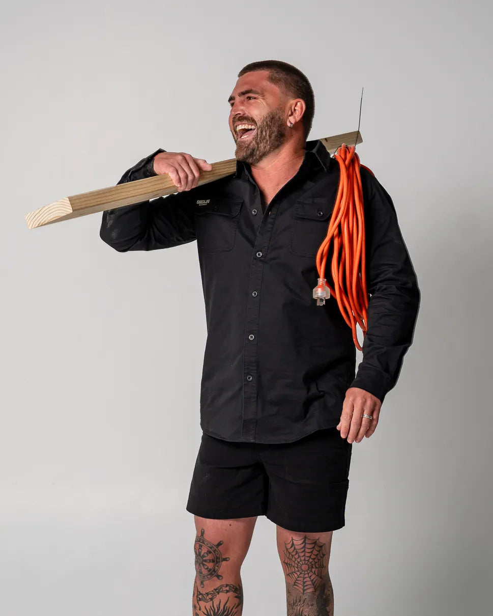 This tradie tuxedo is a favourite in the workshop and will pass for date night with the misses after, our black long sleeve button up work shirt is made from durable stretch fabric designed to be cool with armpit and back vents.